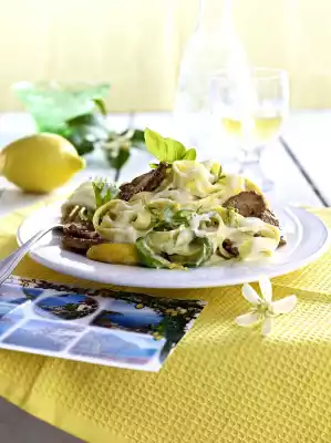 Add 1-2 tablespoons lemon juice. Swivel the meat in it. Drain the noodles. Mix with rocket, basil and sauce. Arrange medallions and garnish with lemon. Drink tip: cool white wine, e.g. Pinot Grigio.