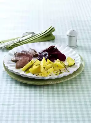 Cut the meat into slices. Season beetroot salad with salt and pepper and arrange on plates with potatoes and meat