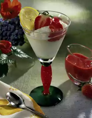 Cut 1 strawberry into 4 slices. Divide the lemon sorbet between 4 glasses. Add strawberry sauce. Decorate with strawberry and lemon slices