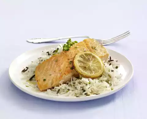 Heat the oil in a coated pan. Fry the salmon on both sides for 4-5 minutes until golden brown. Add the lemon slices to the pan 1-2 minutes later and fry as well. Drain rice and stir in thyme leaves. Arrange the salmon on the rice and garnish with lemon and thyme