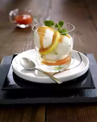 Shape the sorbet into 8-12 balls. Freeze again for at least 30 minutes. Arrange the sorbet and melon sauce in pre-cooled glasses with 1 slice of lemon each. Decorate with the rest of the lemon balm. If necessary, add the rest of the sauce separately.
