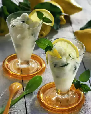 Pour the sorbet into four dessert glasses and serve decorated as desired with remaining mint leaves, lemon slices and lemon peel.
