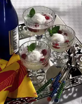 Put one ice ball in each glass. Spread raspberries on top. Fill up with Prosecco. Decorate with mint and serve immediately.