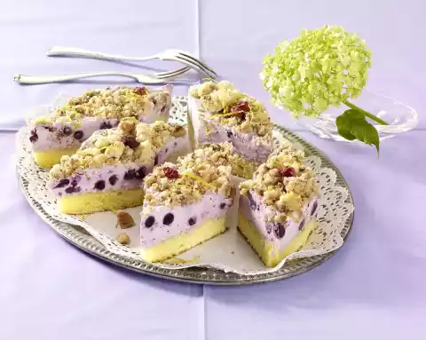 Bake in the preheated oven (electric cooker: 175 °C/ convection oven: 150 °C/ gas: level 2) for about 10 minutes until golden brown. Take out and let cool down briefly. In the meantime, put 125 g flour, muesli, 1 packet of vanilla sugar, 100 g sugar, butter in pieces, 1 pinch of salt and 1 egg in a large bowl. Mix with the dough hook of the hand mixer. Then work into crumbles with your hands and sprinkle onto a baking tray lined with baking paper. Bake in a preheated oven (electric cooker: 175 °C/ convection oven: 150 °C/ gas: level 2) for approx. 10 minutes until golden brown, stirring occasionally. Remove the crumbles and let them cool down. Turn out the sponge cake onto a damp tea towel. Peel off baking paper. Let the sponge cake cool down completely. Soak the gelatine. Drain the blueberries, collecting 150 ml of juice. Mix quark, yoghurt and blueberries. Heat blueberry juice and 100 g sugar in a small pot while stirring until the sugar is dissolved. Squeeze out the gelatine and put it into the pot. Dissolve the gelatine while stirring as well, remove the pot from the stove. Add 1-2 tablespoons of the quark yoghurt mixture to the pot and stir.