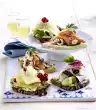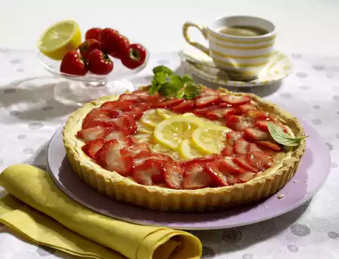 Bake in the preheated oven (electric cooker: 200 °C/ convection oven: 175 °C/ gas: level 3) for about 20 minutes. Melt 50 g butter. Beat 2 eggs and 150 g sugar until white-creamy. Stir in lemon zest and juice bit by bit. Carefully stir in lukewarm butter. Remove the base, remove the baking paper with dried peas. Add lemon cream. Turn down the oven temperature (electric cooker: 175 °C/ circulating air: 150 °C/ gas: level 2) and bake for another 15 minutes. Leave to rest for 10 minutes in the switched off oven, remove from the oven and allow to cool in the mould. Wash the lemon, grate dry and cut into thin slices. Bring 100 g sugar and 200 ml water to the boil and boil down to half. Put lemon slices in, take them off the stove and let them cool down. Take them out and let them drain, catching the syrup. Wash and clean the strawberries and cut them into thin slices.