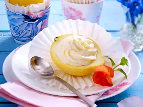 Then quickly squirt the piping bag into the lemon halves or fill in with a spoon and freeze for at least 6 hours, preferably overnight. Arrange the parfait baskets and decorate with flowers as desired.