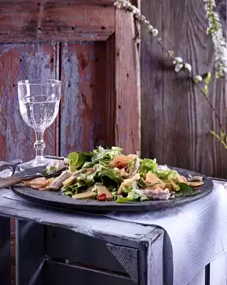 Wash mint, shake dry, pluck leaves from the stalks and chop coarsely. Open the baking paper, take out the chicken fillets and pluck them finely with two forks. Marinate salad with salad dressing, arrange on plates together with melons and chicken pieces and sprinkle with mint