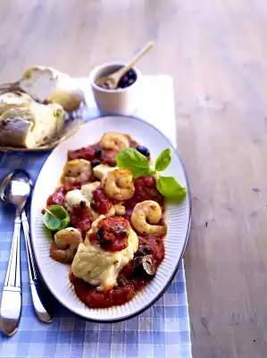 Wash the fish and pat dry, cut into pieces. Season with salt and pepper. Stir basil, olives and capers into the tomato sauce, season everything again. Place the fish and prawns on the tomato sauce, cover and cook over a low to medium heat for 6-8 minutes. Serve garnished with basil set aside. Serve with olive ciabatta and a fresh salad