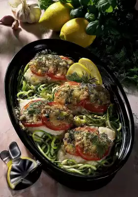 Wash ling fish fillets, dab dry and cut into 4 equal pieces. Sprinkle fish with lemon juice. Salt and leave to stand. Clean and wash the zucchini and cut them lengthwise into thin slices with a peeler. Blanch in boiling salted water for 1-2 minutes. Drain on a sieve. Peel garlic and press it through a garlic press or chop it finely. Mix olive oil and garlic and add to the zucchini. Pour into an ovenproof dish. Place the fish fillet on the zucchini. Wash the tomatoes, dab dry, cut into slices and place on the fish fillets. Sprinkle with salt and pepper. Wash the herbs and dab dry. Chop the basil and dill, except for something to garnish, and cut the chives into fine rolls. Mix cheese, breadcrumbs and herbs and sprinkle over the tomatoes. Bake in the preheated oven (electric cooker: 200°C/ gas: level 3) for 20-30 minutes. Serve garnished with dill and lemon. Serve with fresh baguette or rice