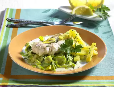 Add finesse and processed cheese to the leek, stir. Season leek with salt and pepper. Chop parsley finely, except for something to garnish. Sprinkle potatoes with parsley, arrange leek and fish on plates.