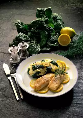 Arrange the fish fillets on the lemon slices and serve with the spinach mashed potatoes. Sprinkle with some cayenne pepper and garnish with dill.