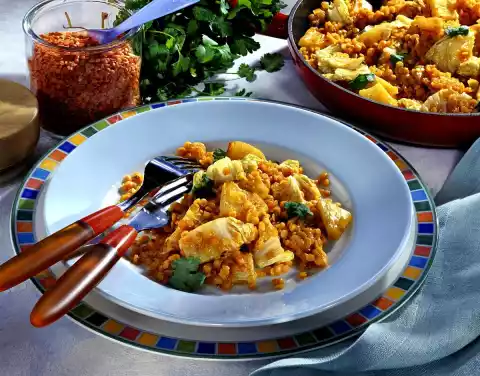 Clean the Chinese cabbage and cut it into strips about 2 cm wide. Peel and finely chop the onion. Heat the oil in a pan and fry the Chinese cabbage strips in it. Season with salt and pepper. Take out and put aside. Sauté the onion in the frying fat, add the lentils and sprinkle with curry.