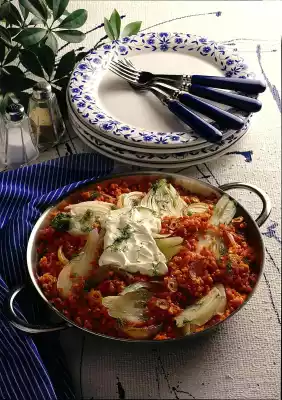 Fry the onion slices in it until golden brown. Season lentils with salt and pepper. Add the onions. Serve lentil risotto garnished with crème fraîche and fennel green.