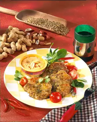Deglaze with 600 ml water, cover and cook over medium heat for about 40 minutes. Meanwhile heat 2 tablespoons of oil in a small pot, sauté the remaining onions and garlic. Stir in peanut cream. Deglaze with stock and cream. Season with salt, pepper, sugar and chili. Simmer sauce at low heat for 3-4 minutes and keep warm. Wash and halve the tomatoes. Wash, clean and drain the salad. For the vinaigrette, mix vinegar, salt, pepper and sugar. Add 2 tablespoons of oil. Wash parsley, dab dry and chop finely. Remove the lentils from the heat. Season with salt, pepper and coriander. Sift flour over it and stir in. Stir in egg and parsley as well.