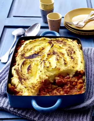 Clean, wash and halve the tomatoes. In the meantime heat milk and butter in a pot. Drain the potatoes, add milk-butter, mash to puree, season to taste with salt, pepper and nutmeg. Add tomatoes to the lentil chili, season to taste and put into an ovenproof dish (approx. 20 x 30 cm).