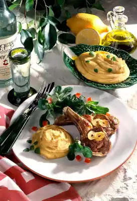 Clean, wash and finely dice the carrots. Peel and chop the onion. Peel garlic, crush 1 clove finely. Wash thyme and oregano, put aside some for garnishing, chop the rest finely. Heat 1 tablespoon of oil in a saucepan, fry carrots, herbs, onion and garlic briefly. Add lentils, deglaze with vegetable stock and cook for about 20 minutes, stirring several times. In the meantime clean, wash and quarter the tomatoes and remove the seeds. Finely dice tomato quarters. Clean lamb's lettuce, wash thoroughly, drain well. For the vinaigrette, mix vinegar, salt and pepper, add the remaining oil and tomato cubes. Wash the meat and dab dry. Heat 3 tablespoons of olive oil in a frying pan, add the meat and fry on both sides for 4-5 minutes. Cut the remaining garlic into thin slices and fry briefly with the chops. Keep meat warm. Puree the lentils with the cutting stick of the hand mixer, stir in the fat, remaining olive oil and crème fraîche. Season with salt and pepper. Arrange everything on plates. Garnish cutlet with garlic slices. Pour vinaigrette over the salad. Sprinkle the rest of the oregano on the puree