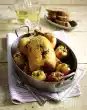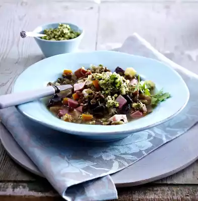Wash the parsley, dab dry, put some aside for garnishing, chop the rest roughly. Mix nuts with remaining onion, parsley and 3 tbsp. oil in a universal chopper to make a pesto. Season with salt and pepper. Remove the meat from the soup, let it cool down a bit and cut it into small cubes. Stir the stock into the soup. Add plums and meat and mix in, season with salt and pepper. Arrange soup in plates. Add a little pesto. Garnish with parsley. Add the rest of the pesto