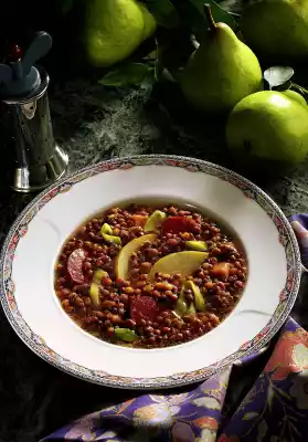 Add lentils and stock. Bring to the boil, cover and cook for 5 minutes. Cut Kabanossi into slices and heat in the soup. Season to taste with salt and pepper