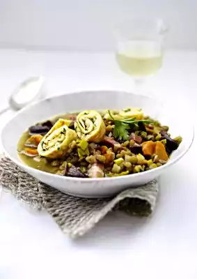 Remove bacon from the soup, remove rind and cut bacon into strips. Put back into the soup. Stir the stock into the soup, bring to the boil once. Season soup with salt, pepper and vinegar. Cut pancake rolls into slices. Serve the soup garnished with pancake and parsley