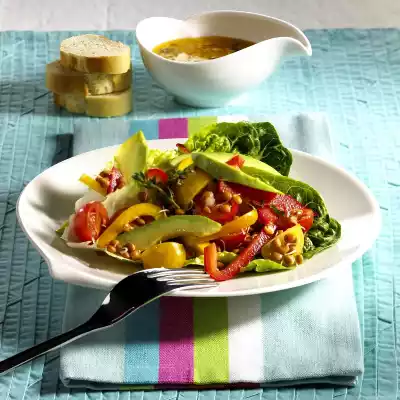 Halve the avocado, remove the core and peel the flesh. Cut into strips and fold into the salad. Arrange the salad in portions on 2 lettuce leaves each. Garnish with thyme. Baguette tastes good with it.
