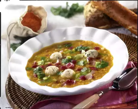 Leave to stand for about 10 minutes. In the meantime peel and finely dice the onions. Clean and wash the leek and cut into small pieces. Heat the oil in a pot and sauté the onions. Add lentils, dust with curry and deglaze with 1 litre of water. Stir in the vegetable-yeast stock and let everything simmer covered for about 20 minutes. Add the leek about 8 minutes before the end of the cooking time. Season with salt, pepper and nutmeg. In the meantime, form approx. 16 small dumplings from the bread roll mixture with moistened hands. Bring salted water to the boil and let the dumplings simmer for about 10 minutes.