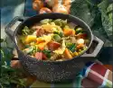 Cut plums into small cubes. Wash, clean and chop the greens. Peel and finely dice onion. Cut the smoked pork loin into small cubes. Wash thyme and parsley, dab dry and, except for something to garnish, pluck from the stalks. Heat the oil in a pot and sauté the onion.