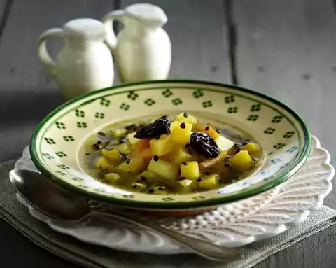 Add vegetables and plums to the lentils and simmer for another 20 minutes. Season to taste with salt, pepper, caraway, vinegar and sugar. Wash the marjoram and dab dry. Pluck the leaves from the stalks and cut them finely.