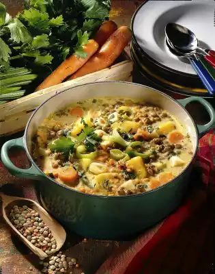 Add the lentils with the soaking water and broth, add thyme and bring to the boil. Cover and cook for about 50 minutes. In the meantime clean and wash the soup greens and potatoes. Cut carrots and leek into slices, celery into cubes.