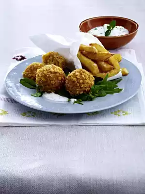 Form 24 small balls from the lentil dough. Roll the lentil balls in the remaining lentils. Heat the oil in a large coated pan. Fry the balls for 8-10 minutes. In the meantime, deep-fry the French fries in portions for about 4 minutes each, take them out, drain the fat, season with sea salt and keep warm. Remove fried falafel from the pan and let it drain on kitchen paper. Arrange the falafel on plates together with chips and salad. Add yoghurt sauce