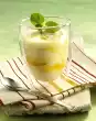 For the lentils, beat the fat, sugar, lemon peel, salt and eggs until foamy. Stir in cottage cheese and flour. Form approx. 12 small lentils from the dough and fry in hot fat until golden brown. Dust with icing sugar and cinnamon. Arrange ice cream and compote on a plate. Decorate with lemon balm leaves if desired