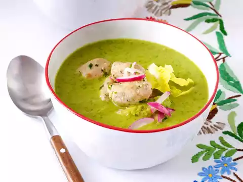 Wash radishes thoroughly, rub dry and cut into thin strips. Heat 1 tablespoon of oil in a frying pan, fry the veal dumplings and radishes for about 2 minutes. Arrange the soup in bowls and garnish with dumplings, salad leaves and radish sticks