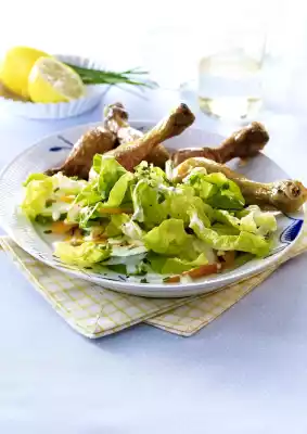 Mix salad, paprika, cucumber and dressing and arrange on a plate with the legs. Sprinkle with chives