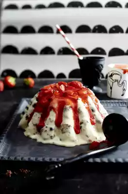 To serve, dip the mould with liquorice ice into hot water until just below the rim. Turn out the ice cream onto a plate. Serve with strawberry puree and strawberries.
