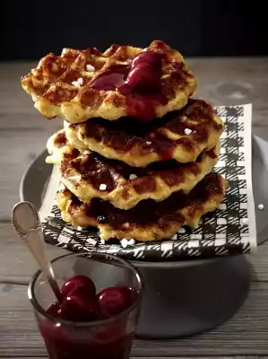 Knead granulated sugar into the yeast dough. Preheat a rectangular waffle iron and spread thinly with oil. Bake approx. 12 golden brown waffles from 2 tbsp. of dough at medium heat. Clean the waffle iron from time to time, as the sugar crystals caramelise. Sprinkle the waffles with some sugar crystals if necessary. Add the stewed cherries