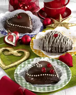 In the meantime, roughly chop the chocolate coating. Melt in a hot water bath. Then cover the hearts with it, drain well and place on a grid. Leave to dry. Decorate with melted white couverture and halved cherries as desired. Cut each heart into 4 pieces