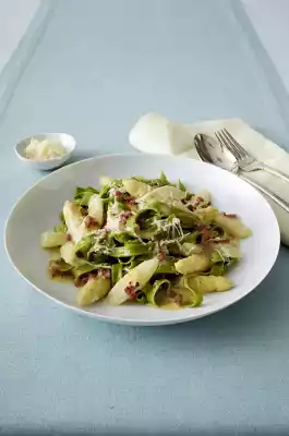 Mix egg, cooking cream, approx. 100 ml asparagus pasta water and 25 g parmesan cheese. Season with salt and pepper. Heat the oil in a large pan and fry the diced ham briefly. Add the pasta and asparagus mixture and fry briefly. Pour over the egg and cheese cream mixture and let it set while stirring. Arrange on 2 plates and sprinkle with the remaining Parmesan cheese