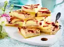 Drain the cherries on a sieve. Put the quark, sour cream, vanillin sugar, 80 g sugar, starch and 2 eggs into a bowl and mix with the whisks of the hand mixer to a smooth cream. Spread the cherries in the mould. Add the cheese mixture and smooth it down. Roll out the rest of the short pastry thinly on a floured work surface and pluck into pieces. Place pieces of dough on the cheese cream