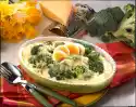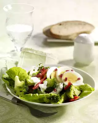 Boil egg in boiling water for about 10 minutes until hard. Clean broccoli, divide into florets and wash. Cook the florets in boiling salted water for 6-7 minutes until firm to the bite. Clean, wash and roughly pluck the salad and drain.