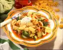 Clean, wash and cut the peppers into strips. Heat the oil in a small, coated pan. Leave the bacon in it until crispy. Remove broccoli, rinse with cold water and drain. Take out egg, quench cold, peel and cut into slices.