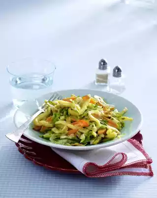 Heat the fat in a frying pan. Sauté the carrots and spaetzle for approx. 4 minutes. Add the pointed cabbage after approx. 2 minutes. Add spring onions and season with salt and pepper. Add cheese, fold in and let it melt. Remove the vegetable noodles from the pan and serve immediately
