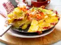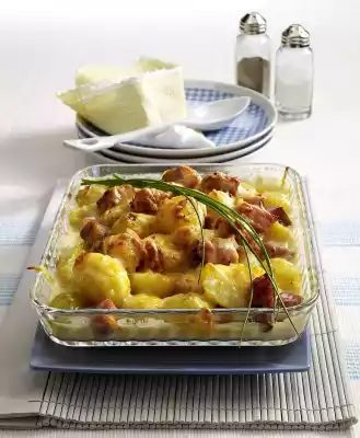 Heat oil in a pan. Fry the pork loin briefly. Drain potatoes, rinse and peel. Pour potatoes, cured pork loin and sauce into a greased ovenproof dish. Sprinkle with cheese and bake in a preheated oven (electric cooker: 200 °C/ convection oven: 175 °C/ gas: level 3) for approx. 10 minutes. Garnish with chives