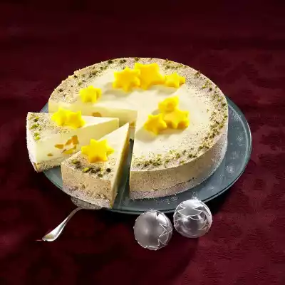 As soon as the cream begins to gel, fold in the cream. Close a mould edge around the sponge base. Spread the cream on top and refrigerate for 2-3 hours. Remove the cake from the edge of the mould. Cut out stars from the remaining mango slices and decorate the cake with them. Sprinkle with cappuccino powder and pistachios