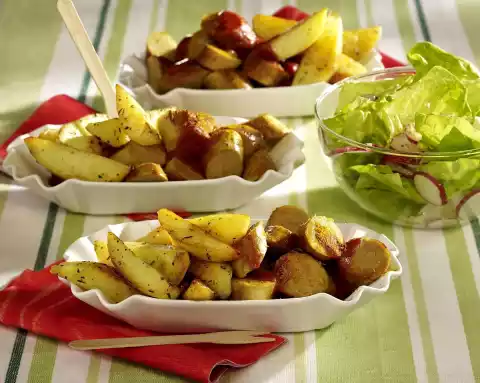 Cook in the preheated oven (electric cooker: 200 °C/ convection oven: 175 °C/ gas: level 3) for approx. 40 minutes. Turn once after 20 minutes. In the meantime, wash the sausages and pat them dry. Fry them in 1 teaspoon of hot oil all around for about 5 minutes.