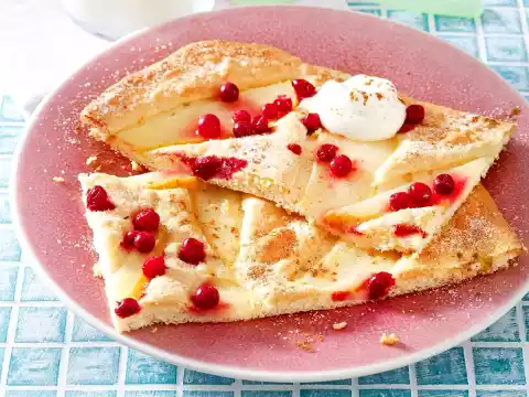 Separate eggs. Beat the egg whites and 2 tablespoons of cold water until stiff, adding 90 g of sugar. Stir in egg yolks. Mix flour and baking powder, sieve over the mixture and fold in. Spread the mixture on a baking tray lined with baking paper (approx. 32 x 37 cm), cover with pear wedges and bake in a preheated oven (electric range: 200 °C/ convection oven: 175 °C/ gas: level 3) for approx. 12 minutes until golden brown. Wash the cranberries, dab dry and spread on the pancake about 3 minutes before the end of the cooking time