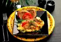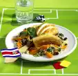 Add the peppers and peas to the paella about 10 minutes before the end of the cooking time. Add the meat and warm it up. Remove thyme. Season paella with lemon juice. Season with salt, pepper and sugar and arrange on plates.