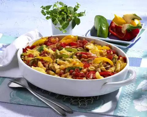 Fold in the chicken meat. Put the noodles into a flat casserole dish (approx. 2 litres capacity). Spread the vegetable-meat mixture on top and mix carefully with the noodles. Grate cheese and sprinkle over the noodle-vegetable mass.