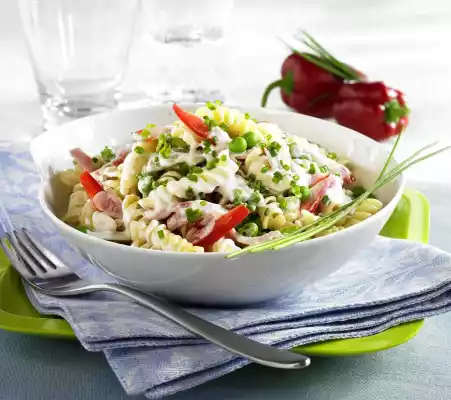Add yoghurt salad cream and mix briefly. Fill the pasta salad into bowls and garnish with 3 chive tips each.