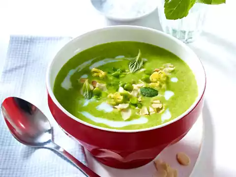 Peel and finely chop the onion. Peel, wash and finely dice the potato. Heat oil in a pot, fry onion and potato until transparent. Add peas, except some for garnishing. Deglaze with broth, bring to the boil, cover and let it simmer for about 10 minutes