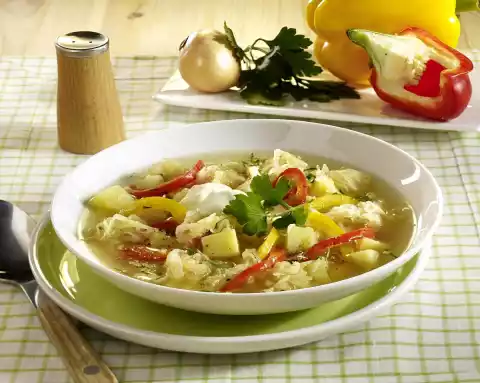 Cut the leaves into fine strips. Halve the peppers, clean, wash and cut into strips. Add the paprika and parsley to the soup. Simmer again for another 5-8 minutes. Season soup with a little salt and pepper.