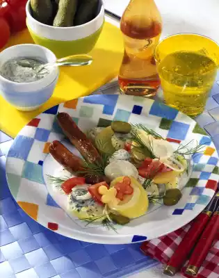 Peel onion and cut or slice into thin rings. Wash and quarter the tomatoes. Cut the flesh into small pieces. Cut cucumber and potatoes into slices. Mix salad ingredients and sauce. Leave to stand for a short time. Season to taste